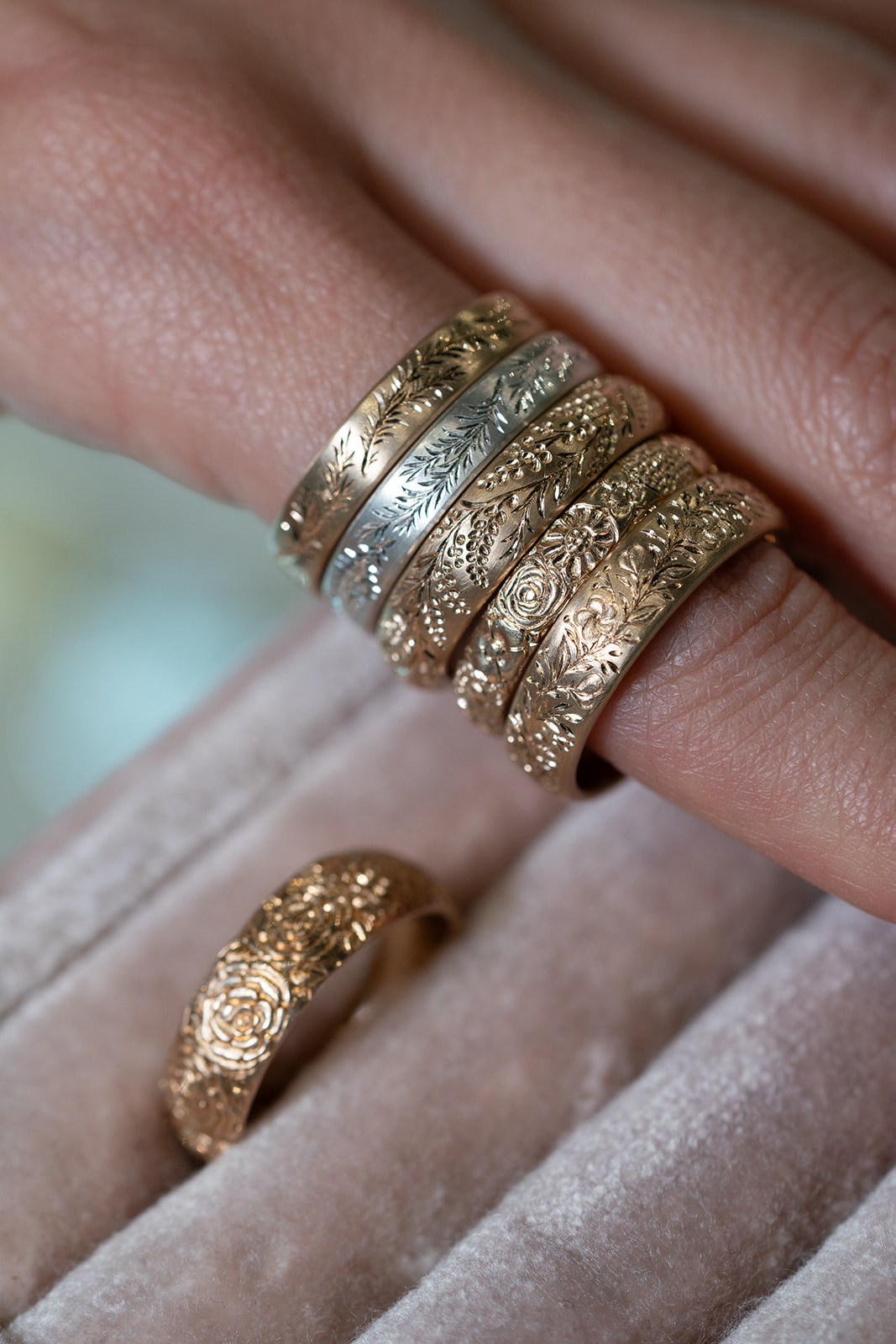 Favorite piece in your collection: I have lots of fun jewelry that I’ve made and some that’s been passed on to me by my grandmother but I have to say my wedding ring is my favorite and most special thing I own! I carved them both by hand out of 18k gold in a deep relief acanthus scroll design.