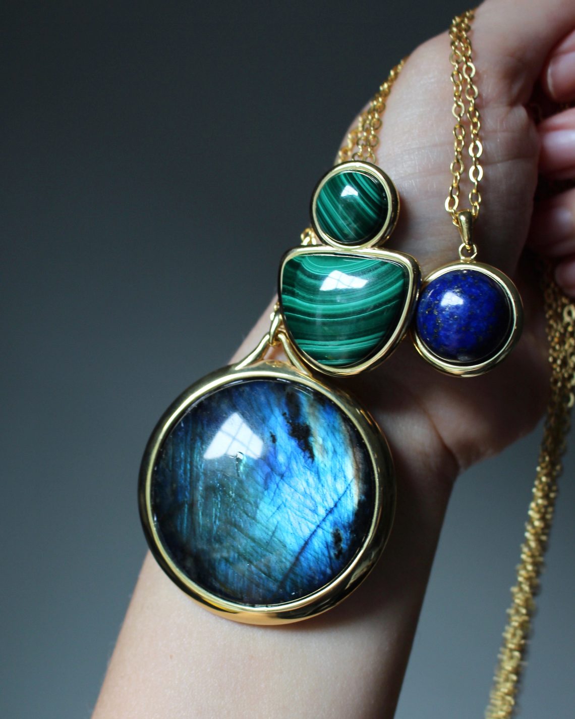 The majority of the pieces have multiple gemstone options for you to choose from—I wanted my favorite gems to be the stars of the show, including malachite, onyx, agate, amethyst, labradorite, lapis, and more. Though it’s difficult to choose, one of my favorite pieces is this double-sided reversible pendant + 18″ chain. The pendant has onyx on one side, and your choice of lapis, labradorite or malachite on the other, so you can switch between gemstones every day, or every hour! The bails of all my pendants are also large enough for you to easily swap out the chain. I also love love love the pendant with two stones — one round and one half circle. This necklace hasn’t left my neck since I announced my launch (it was so hard not to wear it in the meantime). And of course, every pair of earrings in my collection is another favorite — seriously, I cannot choose a favorite and I’m so happy with how everything turned out.