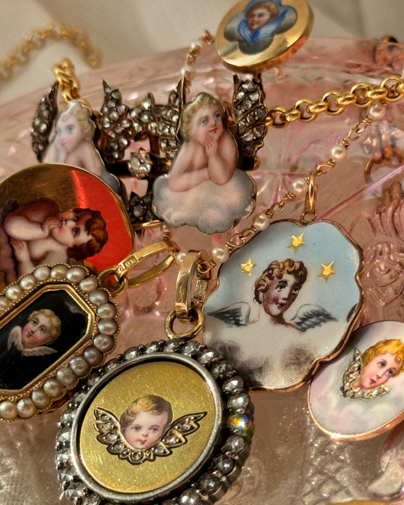 “Motifs I love: anything romantic or whimsical – cherubs, angels, shells, flowers… Especially with fine enameling, they’re truly miniature works of art. I have a soft spot for winged cherubs in particular because they represent so many facets of the human experience at that point in history (and still, now). They could be on pieces of remembrance or mourning, or are symbolic of our hope in a protective and nurturing higher power. I also collect pieces depicting twins because I’m one myself.”
