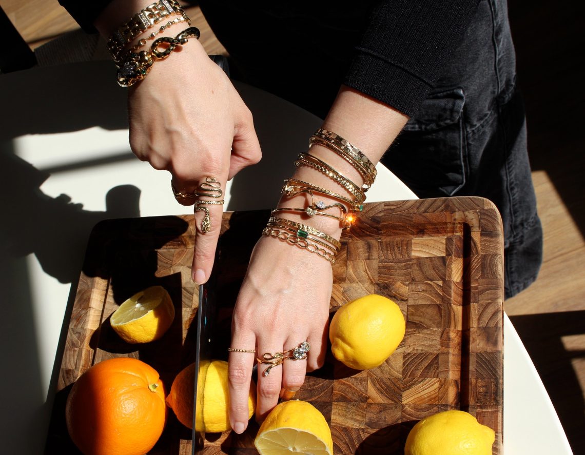 This past year I’ve learned how important it is to make the right investments when it comes to gold bracelets. Out of all the categories of jewelry, I personally think that bracelets get the most wear and tear. They’re constantly being banged against tables, on keyboards and everything in between. I have slowly traded in my semi-hollow bracelets for solid karat gold, and although all gold when worn 24/7 will get scratched up (there’s no way of preventing scratches or dents), solid pieces hold up better in the long run. That’s not to say I don’t have any semi-hollow bracelets in my collection, because I do! And many are my favorite – I just know not to wear them 24/7. I now refer to my bangle stack and my mini stock market on my wrist.