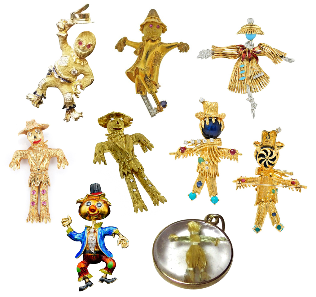 Okay, so now let’s move ahead to midcentury America (the 20th century, to be clear), where jewelry trends started to get wild and wacky. The war is over, the economy is booming, and people are really into scarecrows. The shift from rural to suburban had begun, so the culture was shifting, but the idea of America — golden waves of grain America — was still connected to farming. Not to mention the Wizard of Oz film adaptation had come out not long before, in 1939, featuring a very beloved scarecrow character who, after living a “brainless” existence, goes on to be the wisest creature in all the land.