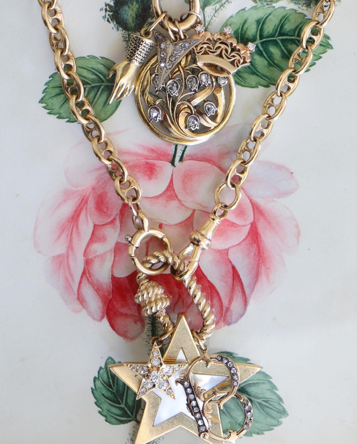 Today’s featured jewelry collector is Beth of RoCo Heirlooms. Beth has an incredible eye for antiques and her necklace stacks and charm combinations are out of this world! Speaking of out of this world, her husband is a former astronomer so celestial motifs are one of her favorite things to collect. I just love her personal collection and so happy to share it with you all today – let’s dive in: