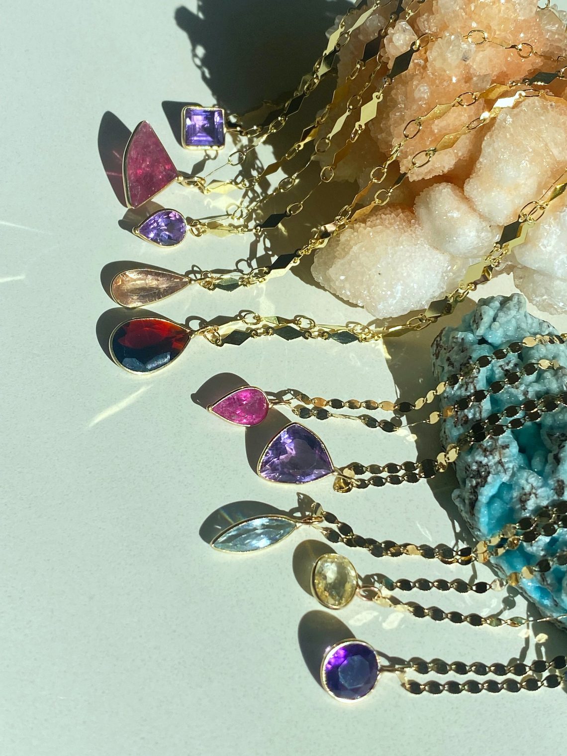If you loved the Sparkle chain + gem charm jewel drop, you will love today’s as well! Our popular Mirror chain is back for the first time after selling out last holiday season. This time we’ve added some incredibly unique gem charms to these chains – gems like tourmaline, amethyst in unique cuts, yellow sapphire, a mega teardrop garnet and one aquamarine icicle.